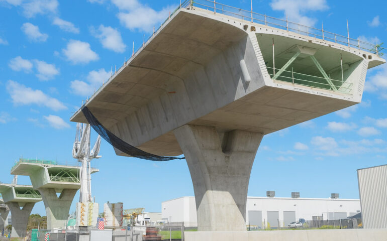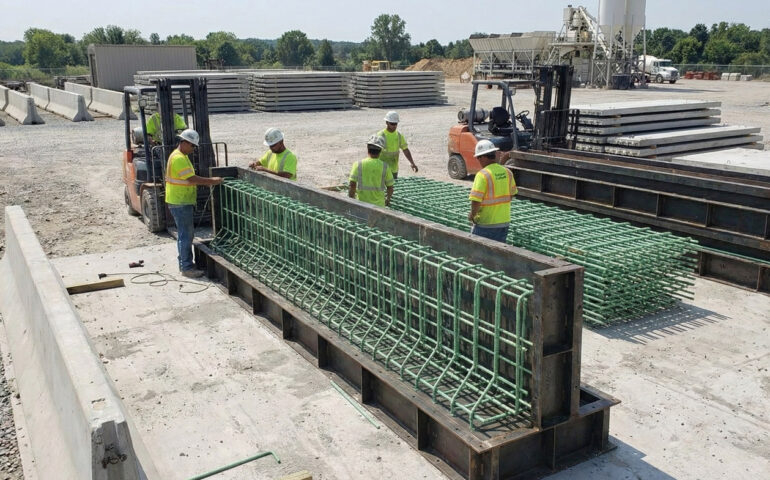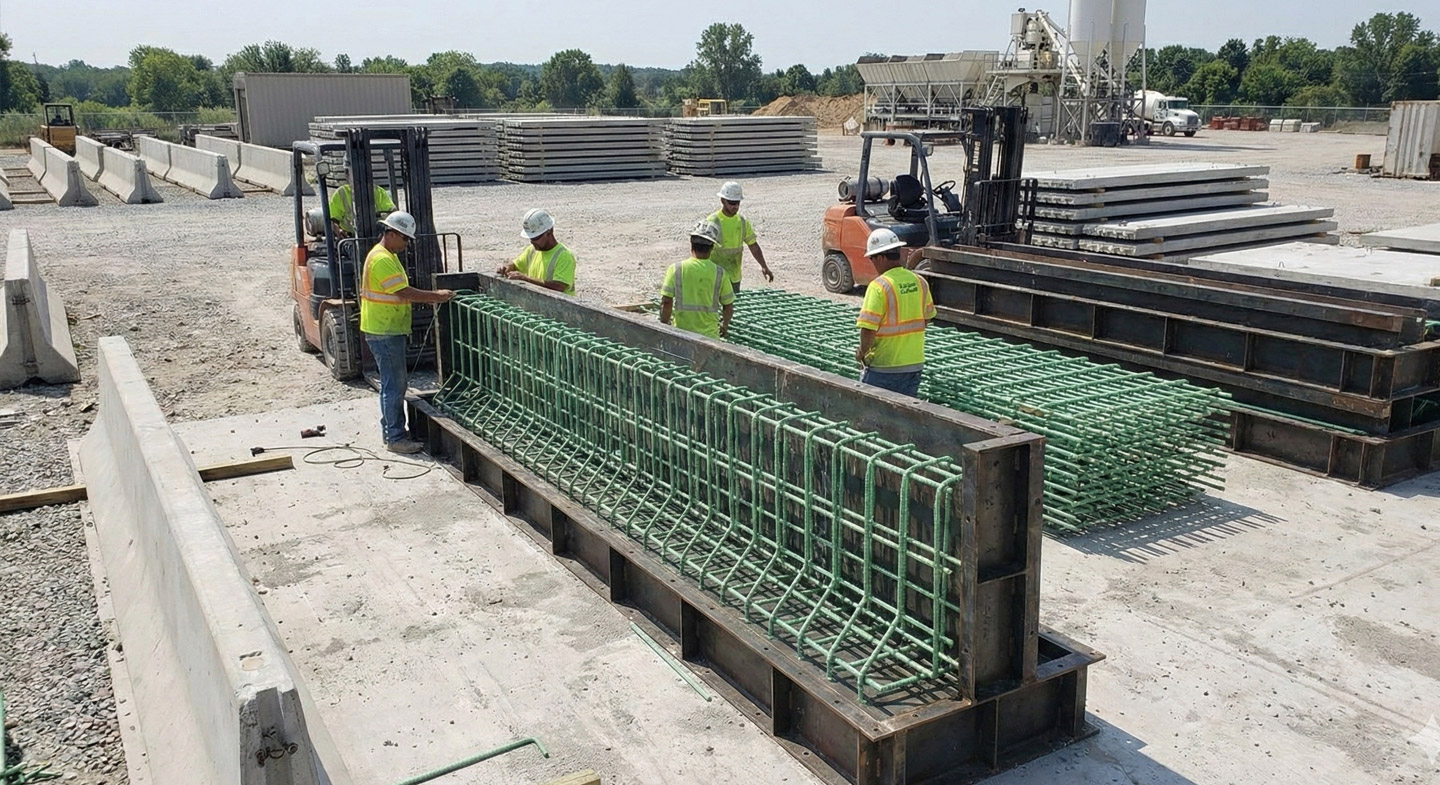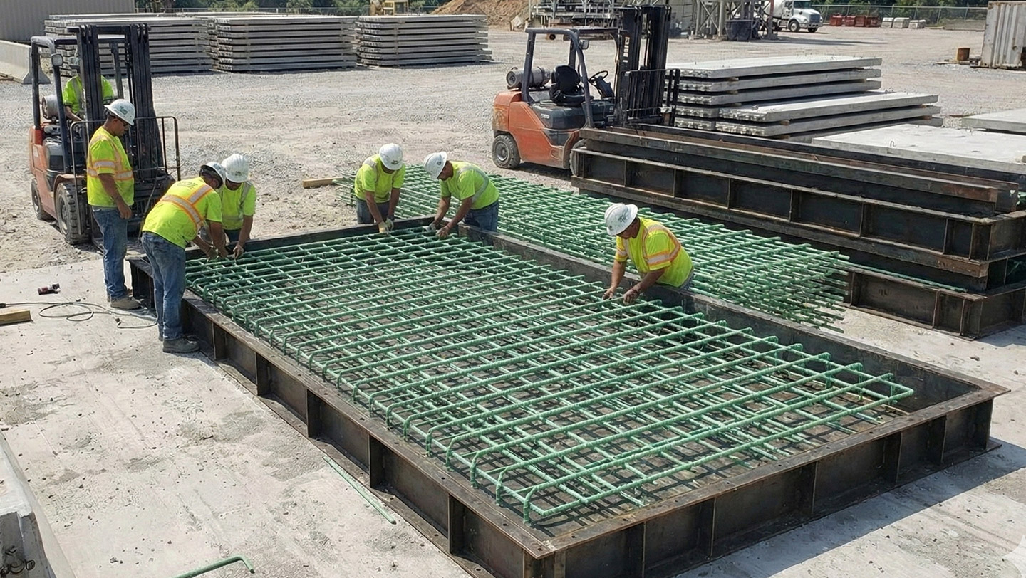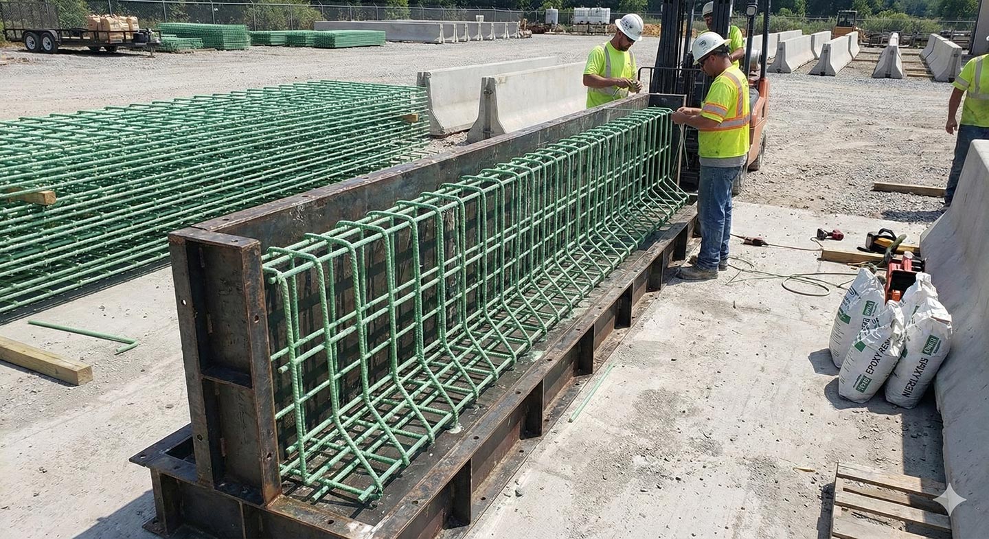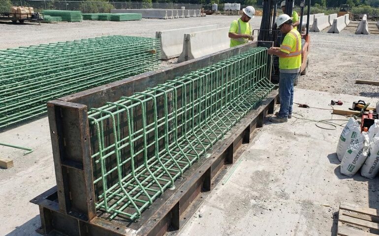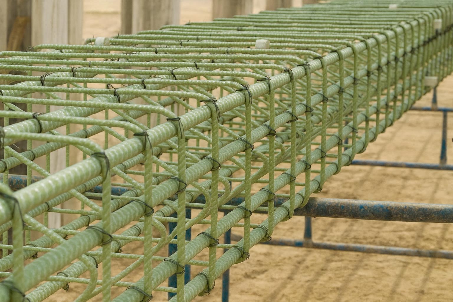• Road bridge barriers are also vulnerable to chloride damage, and are manufactured in PC form using GFRP rebar.