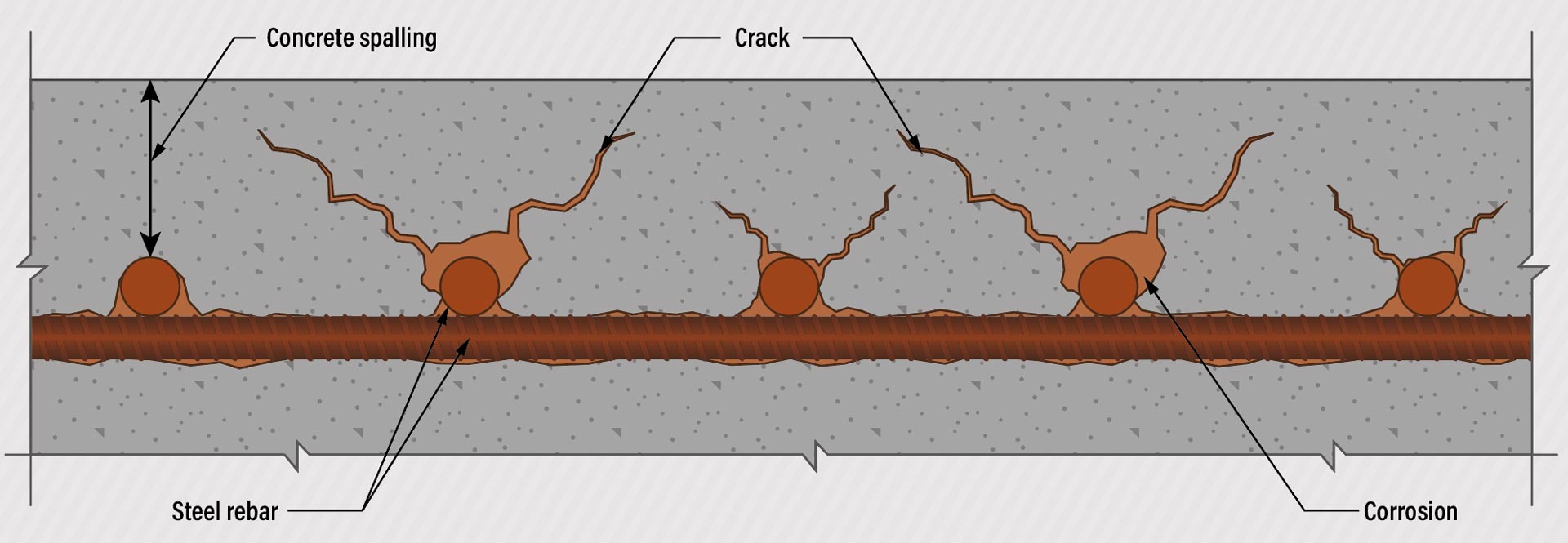 Saat baja berkarat, karat yang terbentuk mengembang volumenya, menciptakan tegangan tarik internal di dalam beton.
